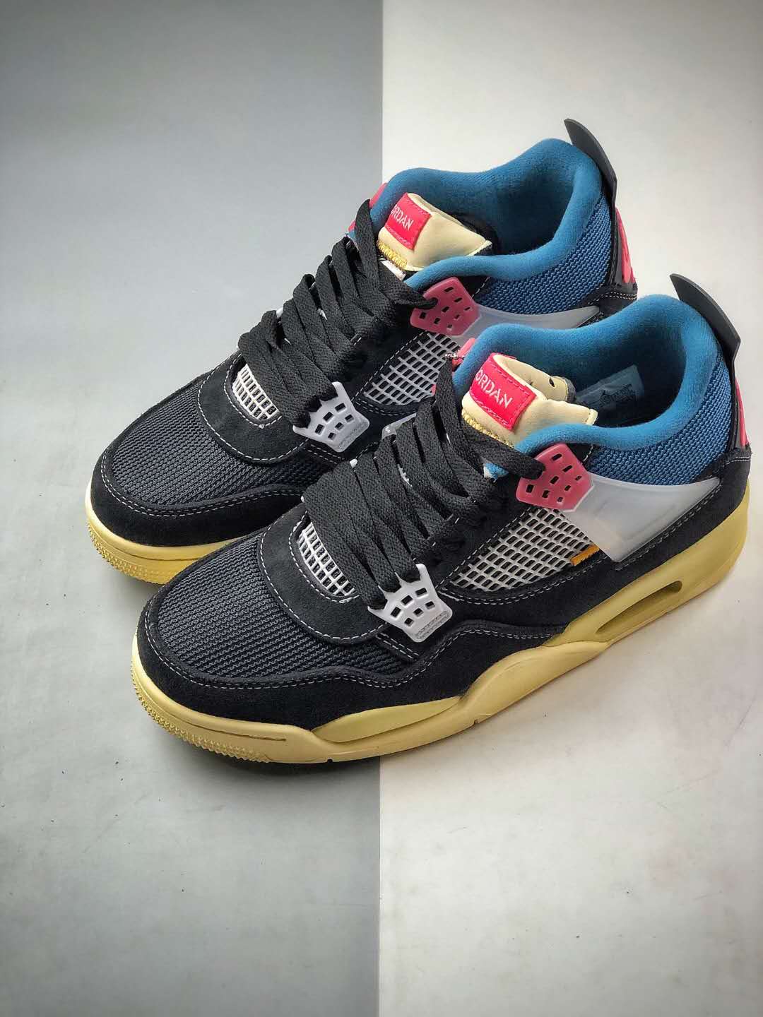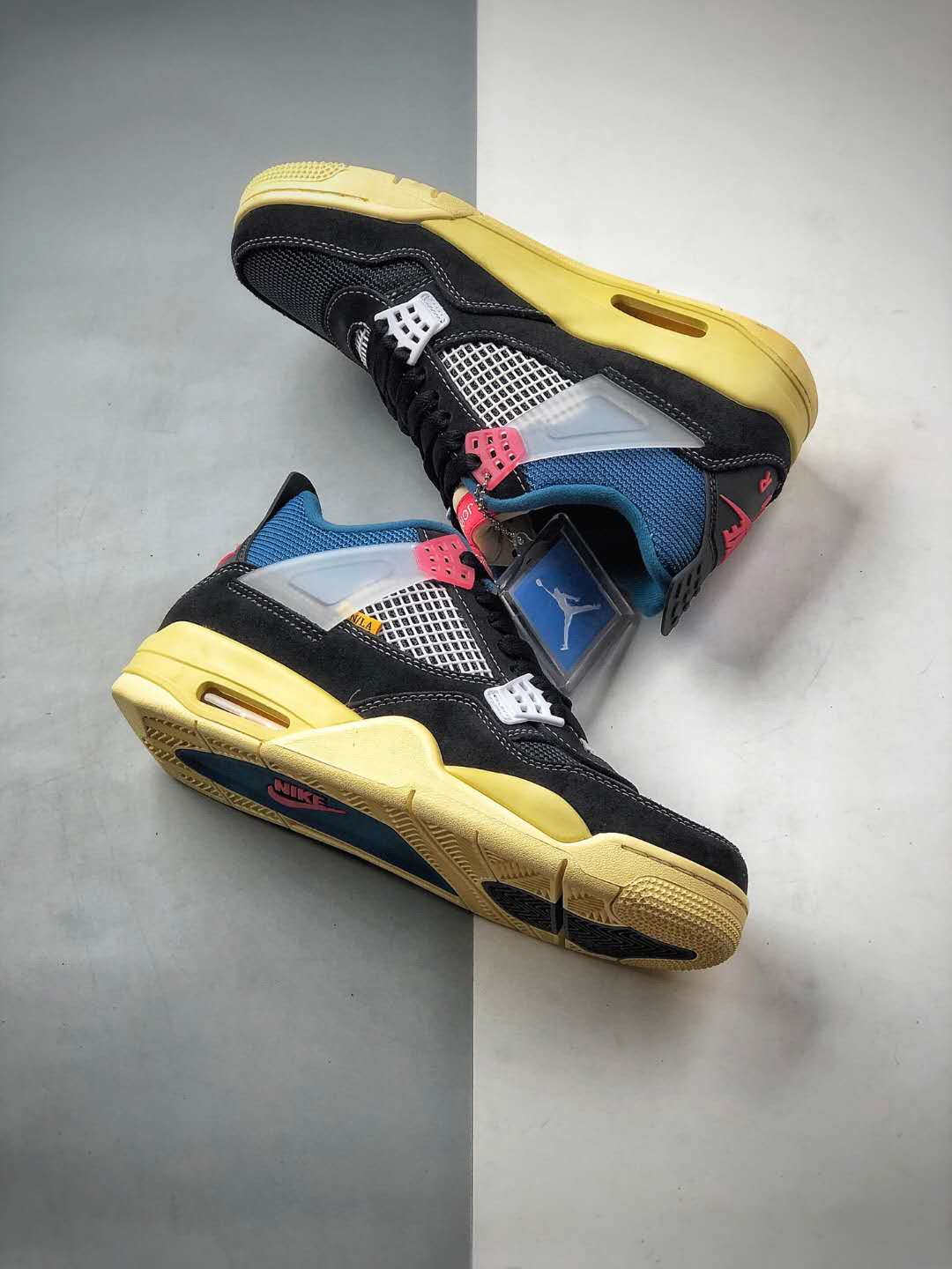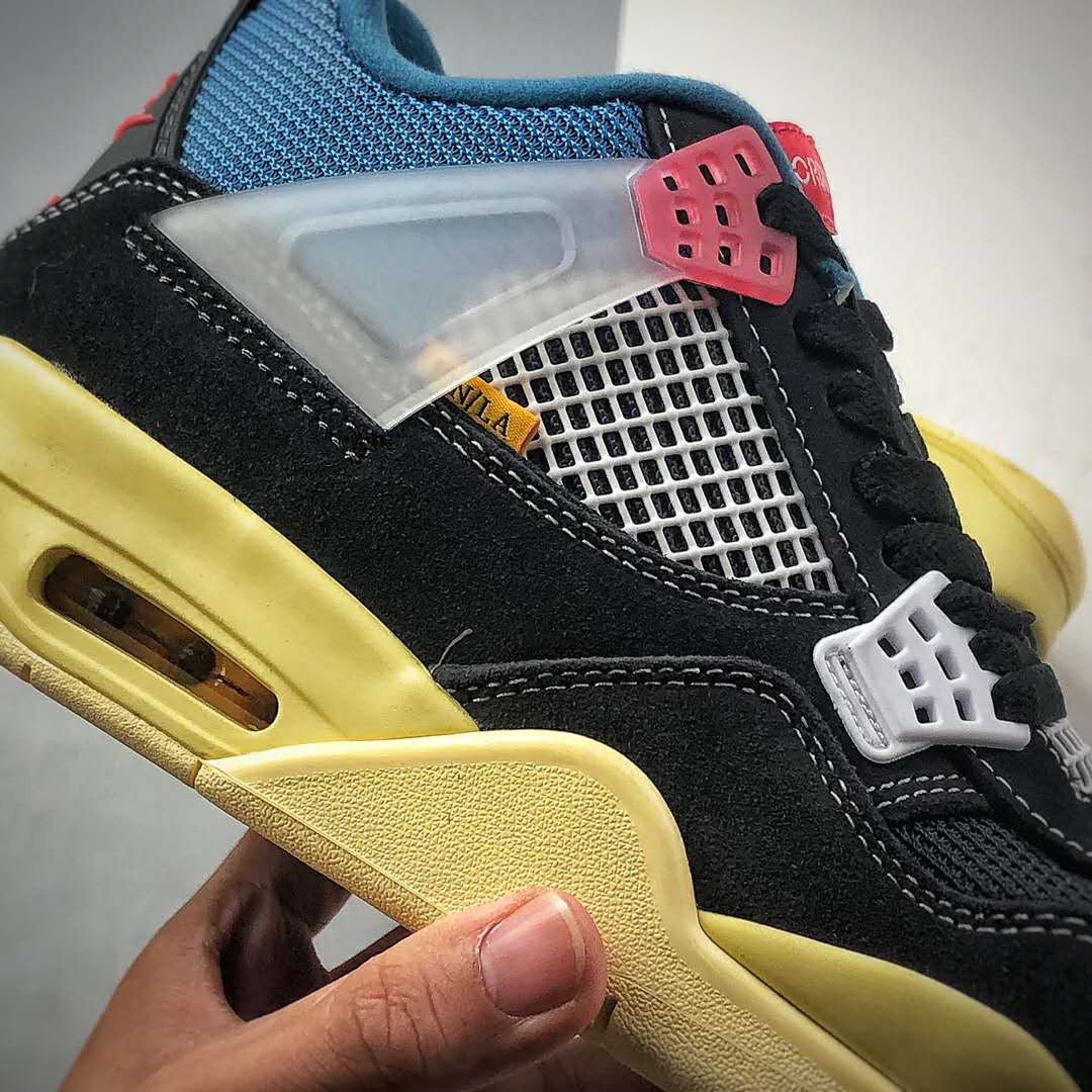 The Union LA x Air Jordan 4 Retro ‘Off Noir’ boasts numerous features that make it a must-have for sneaker enthusiasts. The upper is constructed with a mix of suede, mesh, and TPU materials, resulting in both durability and breathability. The distinct colorway combines black, blue, and cream tones, providing a sleek and sophisticated appearance. The shoe is further enhanced by Union LA’s signature stitching details, which add a touch of artisanal craftsmanship.