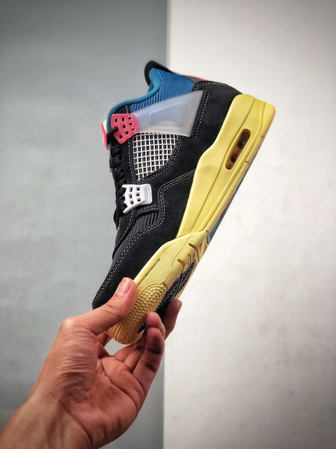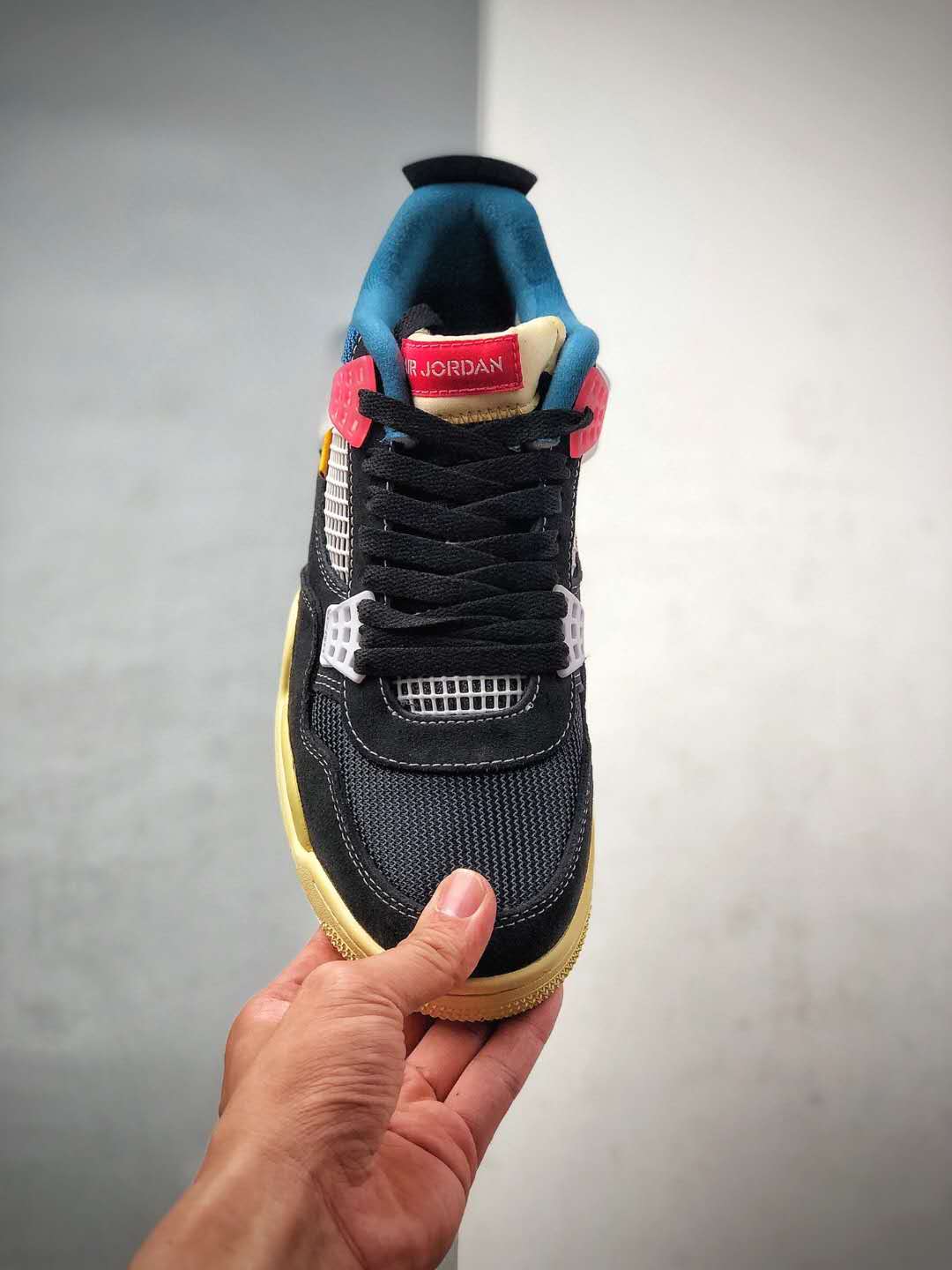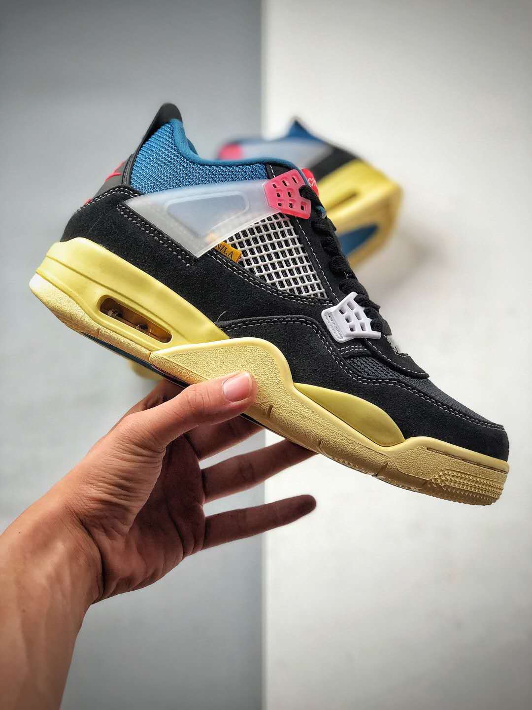 The Union LA x Air Jordan 4 Retro ‘Off Noir’ boasts numerous features that make it a must-have for sneaker enthusiasts. The upper is constructed with a mix of suede, mesh, and TPU materials, resulting in both durability and breathability. The distinct colorway combines black, blue, and cream tones, providing a sleek and sophisticated appearance. The shoe is further enhanced by Union LA’s signature stitching details, which add a touch of artisanal craftsmanship.