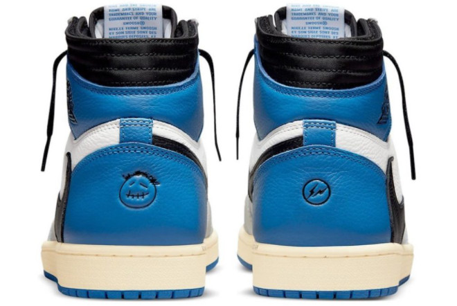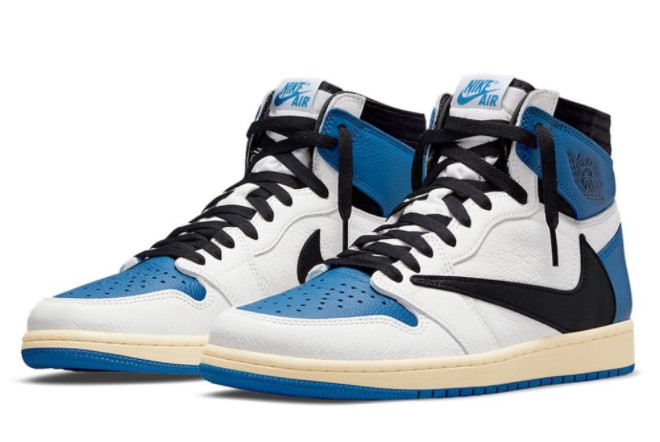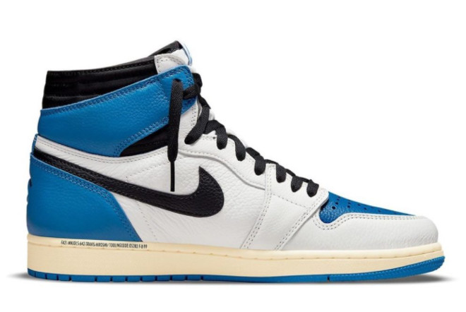 The Travis Scott x Fragment x Air Jordan 1 High OG SP ‘Military Blue’ Sail/Black-Military Blue-Shy Pink features a mid-top silhouette and comes with various premium details. It includes a traditional lacing system, padded collar and tongue for added comfort, and the iconic Air Jordan branding on the wings logo and tongue. The shoe also boasts a visible Air unit in the heel for cushioning and a rubber outsole for traction.